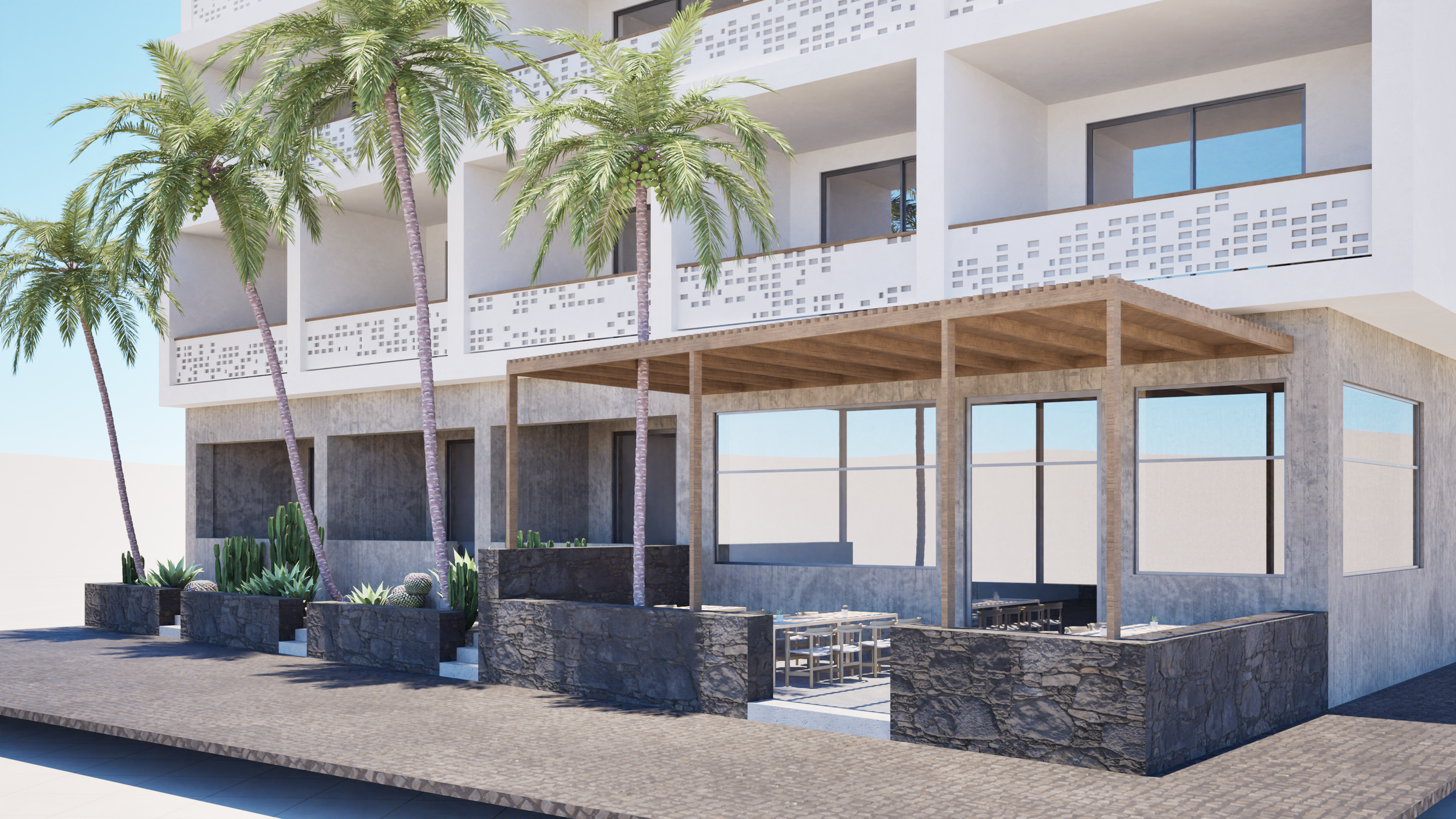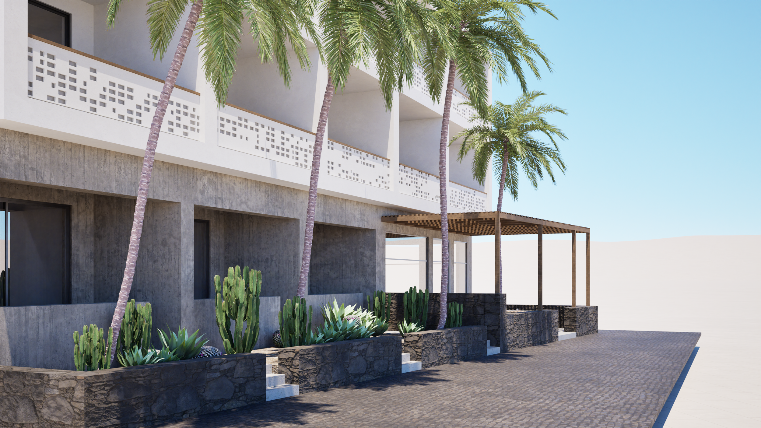 The development of the concept focused on designing a three-star aparthotel that would take full advantage of its prime beachfront location, offering panoramic views of the iconic Ilhéu de Sal Rei, picturesque sunsets, the coast, and the expansive Sal Rei bay, which stretches from the port to the dune landscape of Morro de Areia.