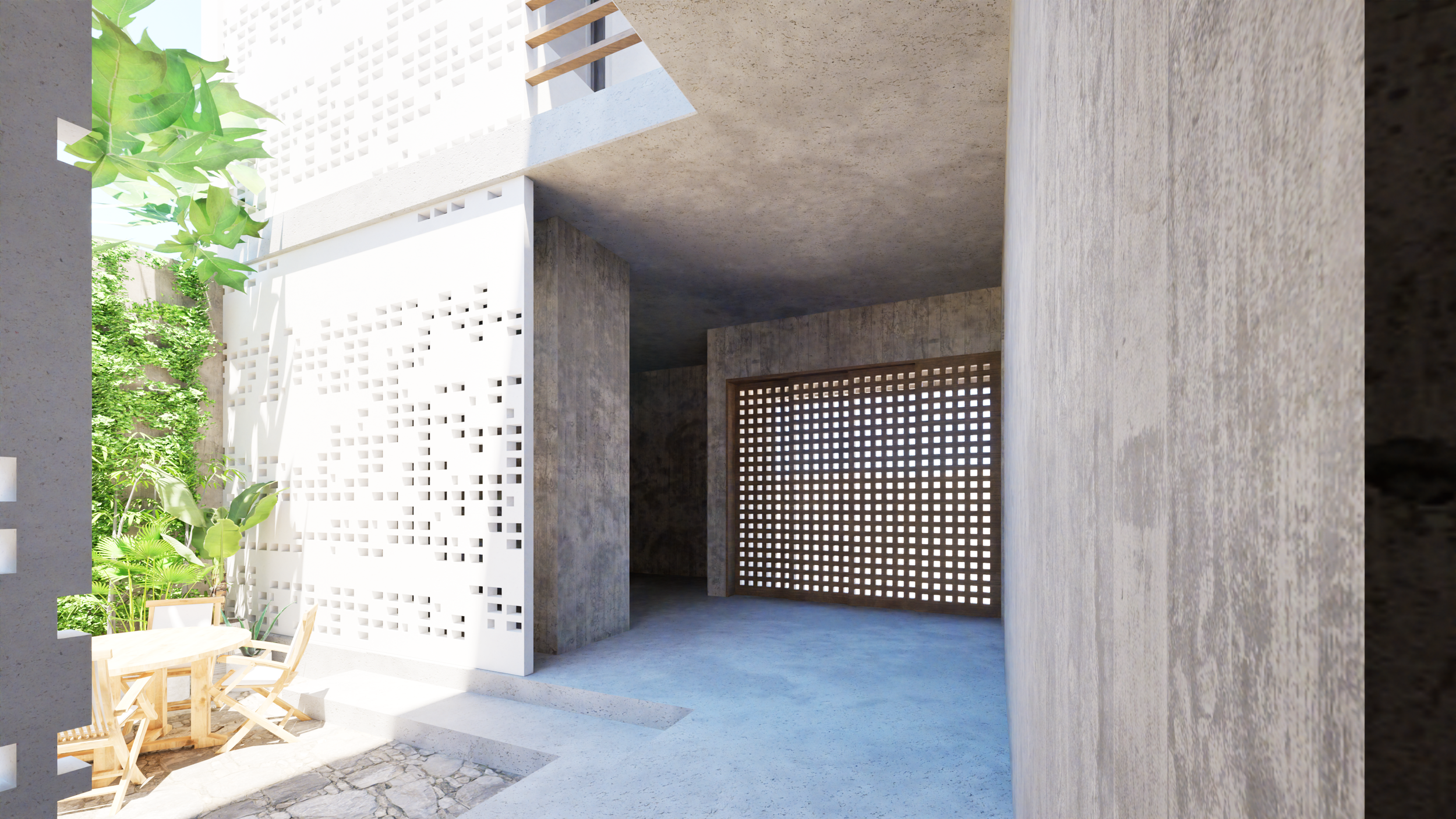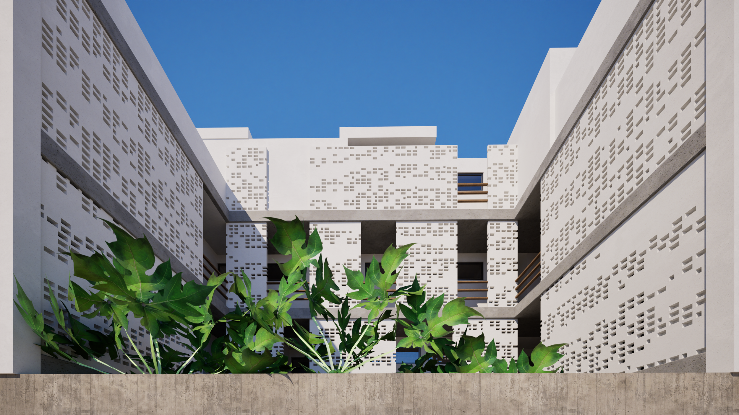 O projecto explorou minuciosamente elementos construtivos e acabamentos superficiais para conferir carácter e personalidade a esta proposta arquitectónica. Isto é evidenciado pelo uso de betão aparente e texturizado no piso térreo, simulando uma estrutura rochosa que sai do solo, os rebocos brancos texturizados com quarzo que aportam textura, assim como pela inclusão de cobogós semitransparentes, que desempenham um papel importante na regulação do vento e da entrada de luz solar nas diversas fachadas do edifício. Durante as horas nocturnas, em combinação com a iluminação, cria-se um cativante jogo de luzes e sombras que proporciona ao edifício uma percepção completamente distinta do exterior, graças ao efeito de retroiluminação das áreas de circulação que se ocultam atrás deste elemento arquitectónico.