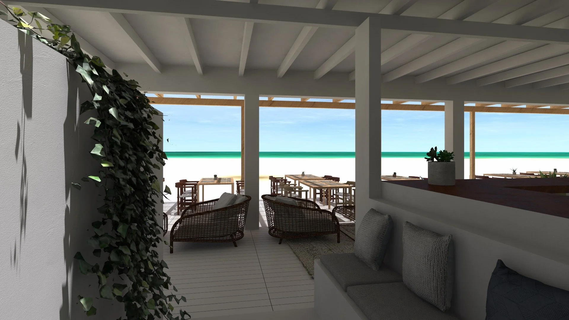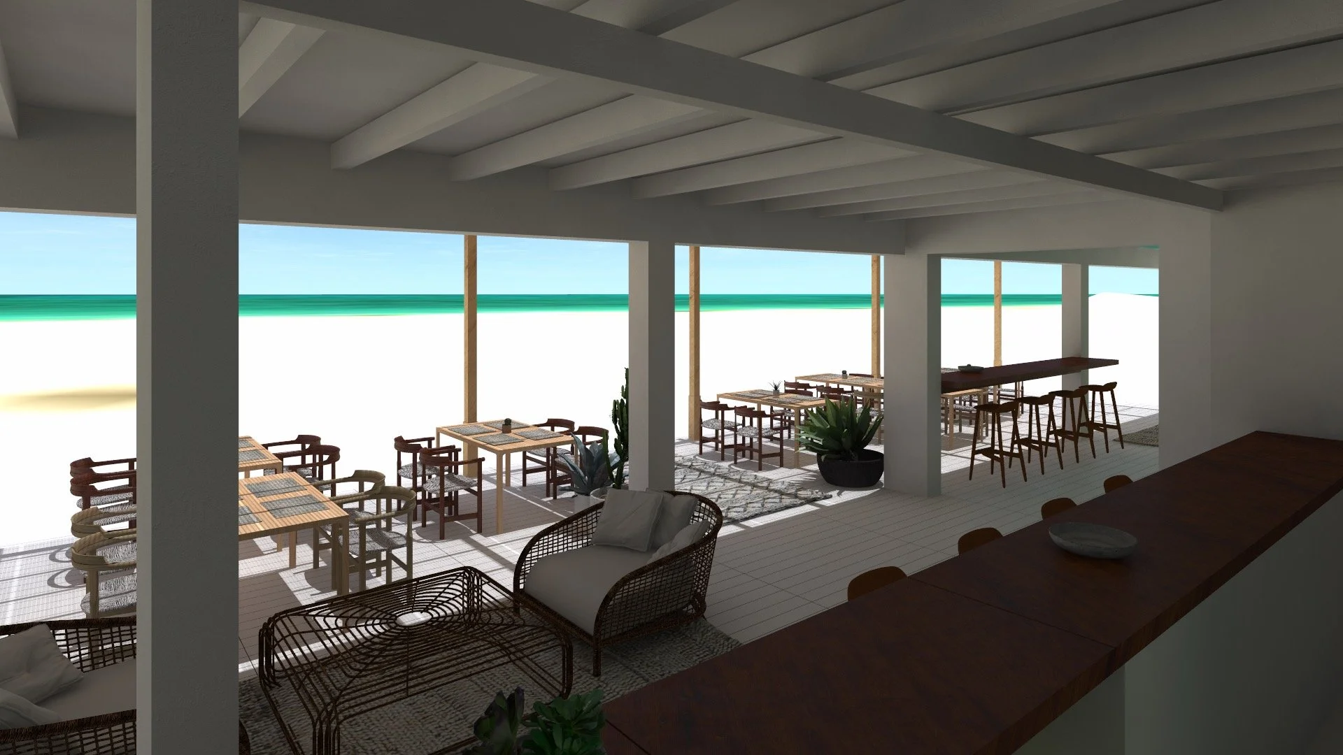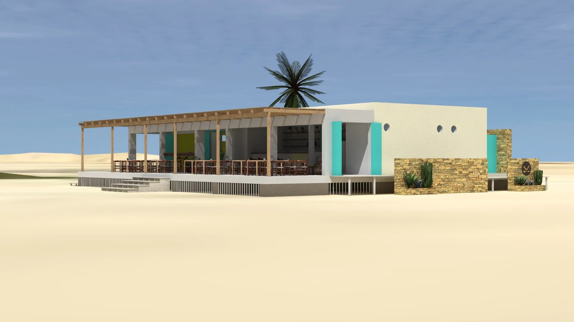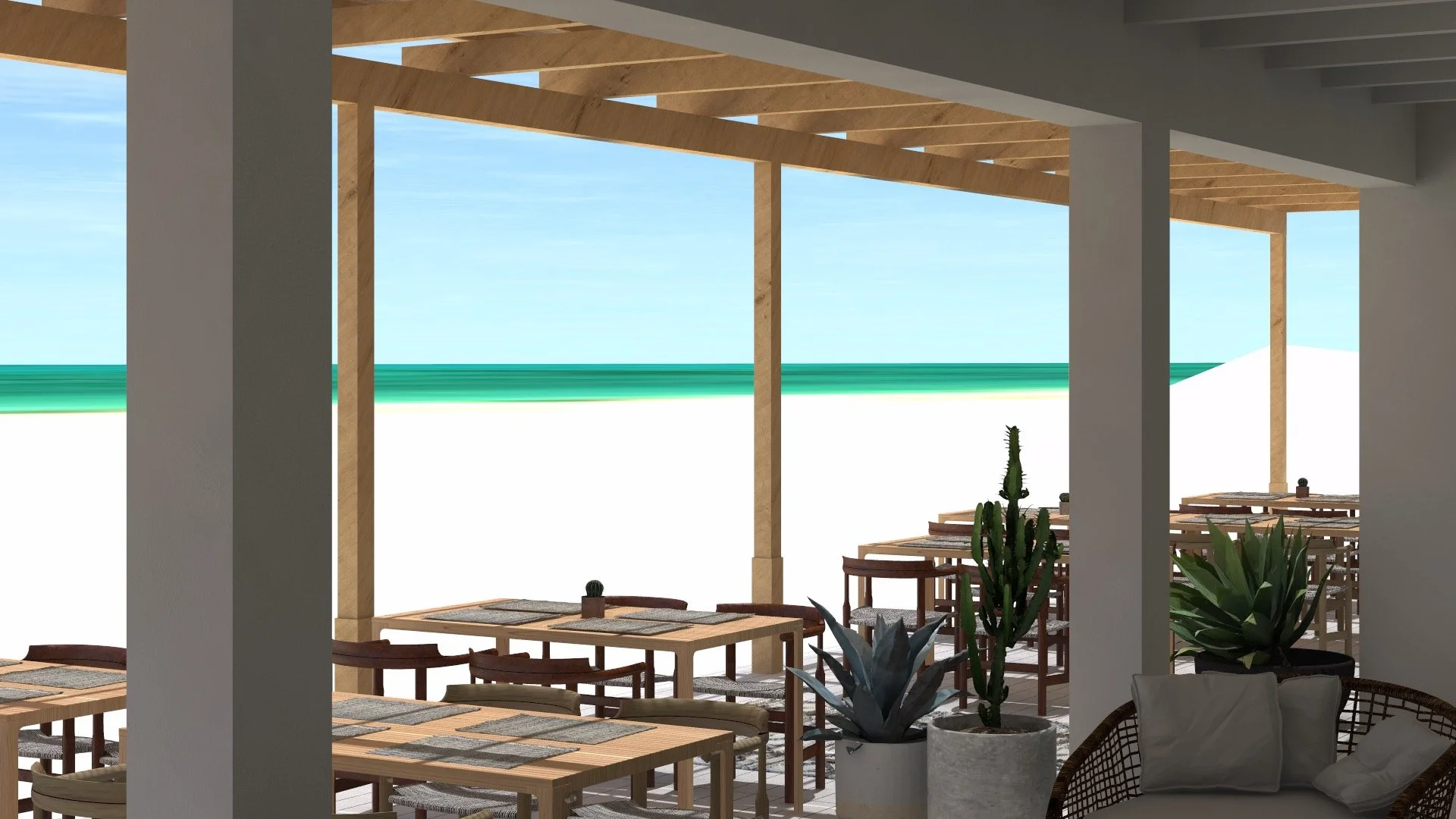 O enfoque do projeto tem como objetivo central consolidar todo o programa numa única estrutura simples e compacta, evitando a necessidade de ocupar a totalidade do terreno. A proposta materializa-se numa unidade volumétrica de madeira que se apresenta de forma neutra e harmoniosa a partir de todas as perspectivas, sem elementos discordantes ou chamativos que possam perturbar o ambiente. Além disso, esta estrutura eleva-se acima do nível do solo e da praia para permitir a passagem da areia e reduzir o impacto ambiental.